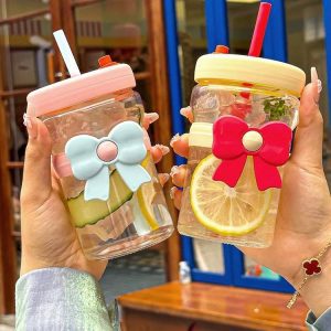 480ml Silicone Colored Bow Fashion Glass Tumbler with Lid and Reusable Straw