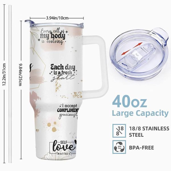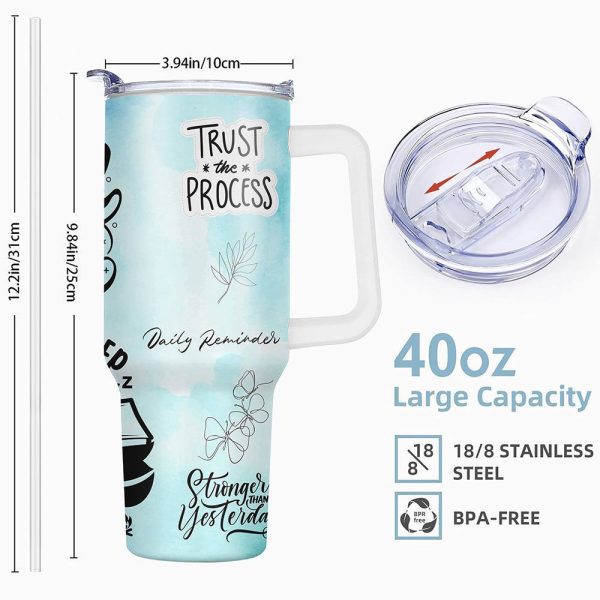 Tags: 40oz, Daily Affirmations, Double Wall, Lifestyle Quotes, Reusable Straw, Slide Lock Lid, Thermal Insulated, Travel Tumbler, Tumbler with Handle, Vacuum Insulated, Vacuum Travel Mug