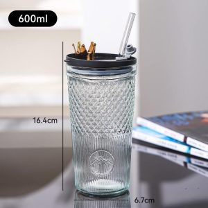 450ml Fashionable Vintage Thick Glass Tumbler with Plastic Straw Hole Lid