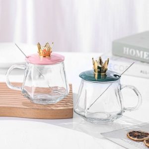 Fashionable Diamond Glass Tea Cup with Crown Top Lid and Metal Spool 350ml