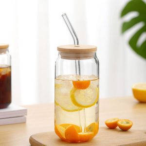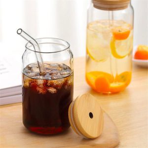 500ml Beer Can Pint Drinking Glass with Bamboo Cover and Glass Straw